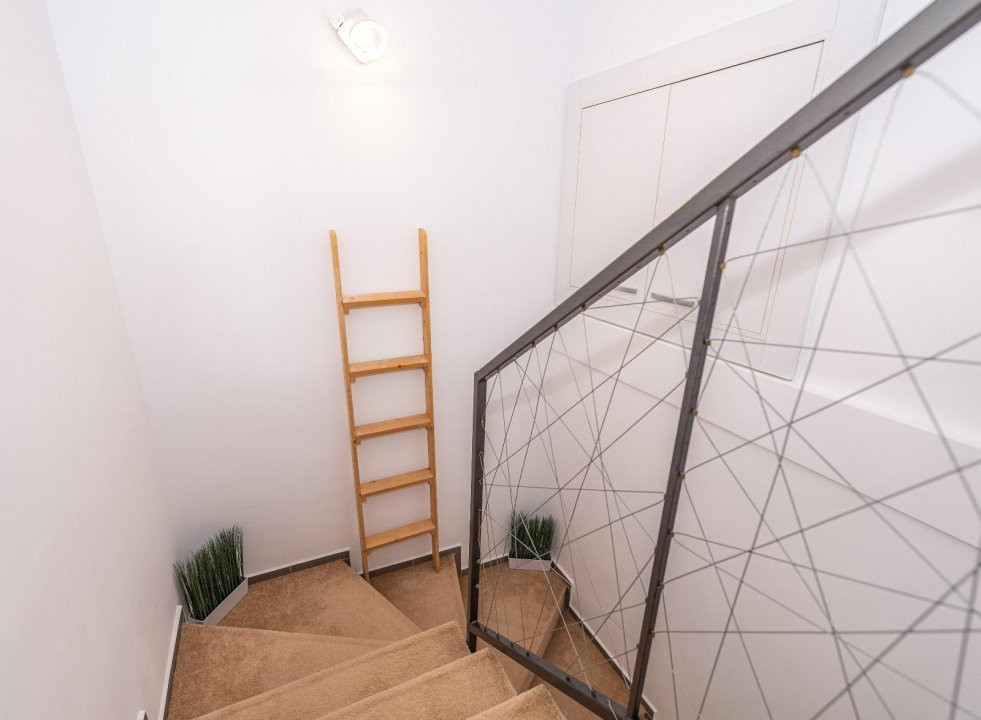 Acest apartament se află într-una dintre vilele din complex și are un design de tip duplex, desfășurat pe două niveluri.