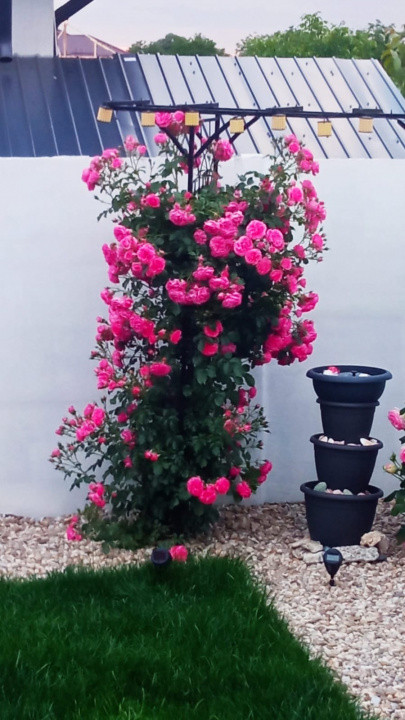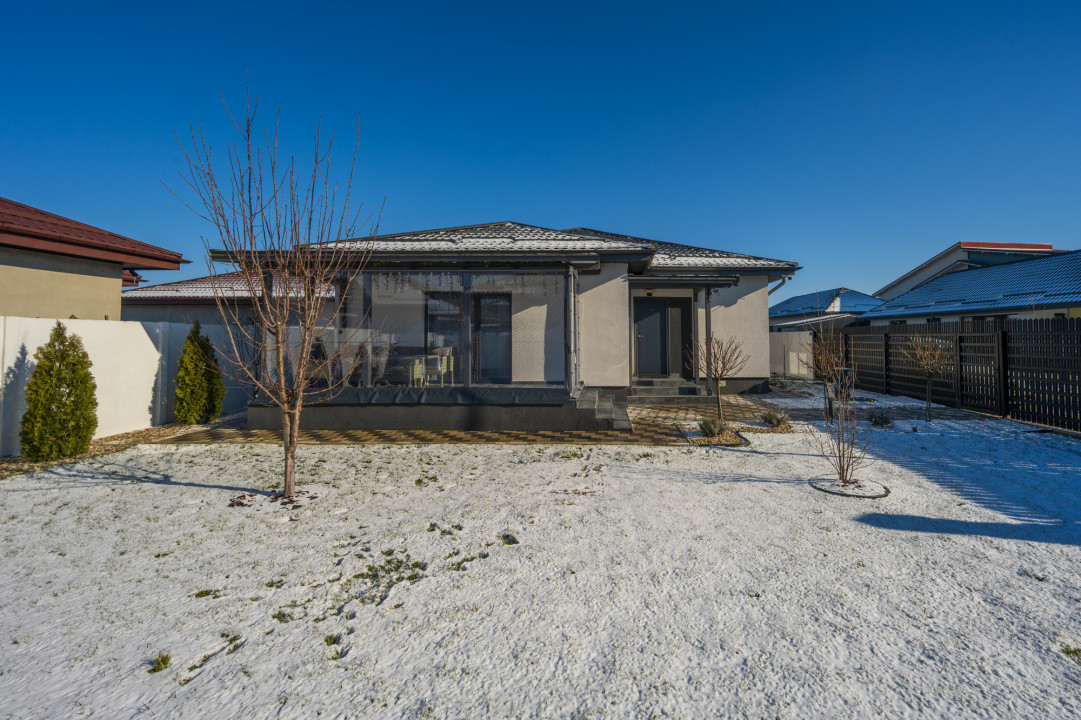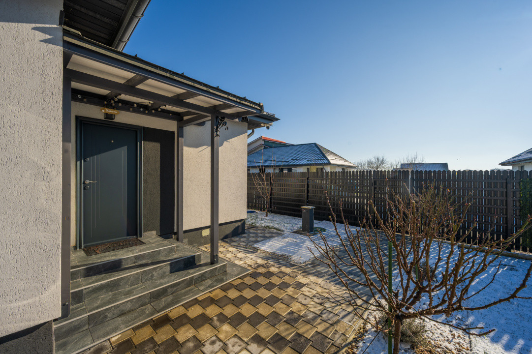 Încă de la exterior, casa transmite soliditate și bun gust. Acoperișul din tablă ondulată Bilka, în nuanță gri antracit, alături de sistemul de scurgere asortat, completează armonios arhitectura. Terenul de 378 mp, cu o deschidere generoasă către drumul de acces, oferă o curte aerisită, frumos organizată și extrem de bine valorificată.